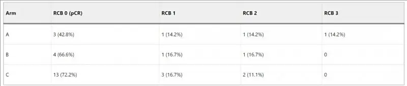 中位随访期为32.8个月,所有组别中可评估患者的总体病理完全缓解率(pCR)率为64.5%(20/30,95%CI:45.4–80.8),无病生存率和总生存率达93.3%。其中,A、B、C组的病理完全缓解率(pCR)分别为42.8%、66.6%和72.7%。