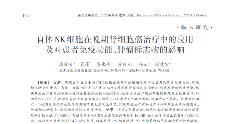 近期,一项发表于《实用医学杂志》的临床研究《自体 NK 细胞在晚期肾细胞癌治疗中的应用及对患者免疫功能、肿瘤标志物的影响》,为晚期肾细胞癌患者带来了新的曙光。